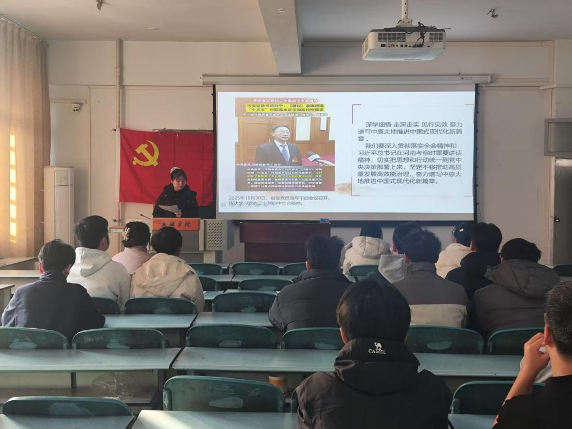 为深入学习宣传贯彻党的二十届四中全会精神,把青年党员的思想和行动统一到全会决策部署上来,2025年12月16日,beat365中文官网员工第四党支部全体党员、入党积极分子开展专题党课学习。本次党课聚焦刘宁主持召开的省级党员领导干部会议宣讲党的二十届四中全会精神核心内容,结合中原大地推进中国式现代化的实践要求,为支部成员筑牢思想根基、明晰行动方向。