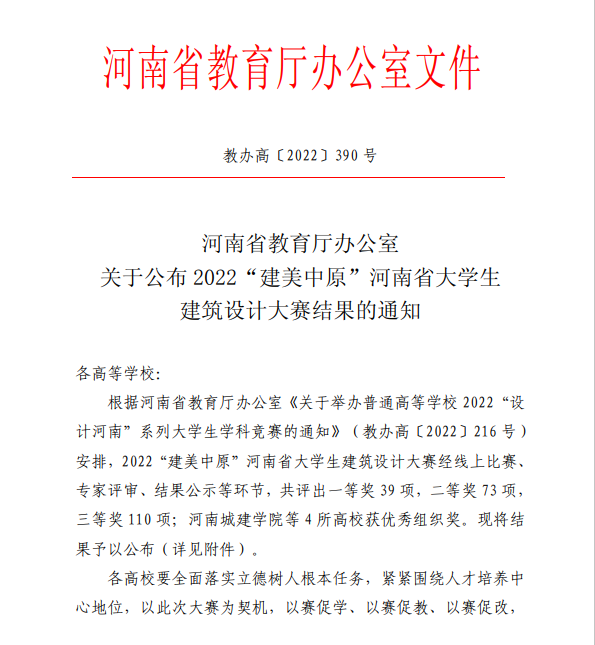 2022年11月16日河南省教育厅公布了2022年“建美中原”河南省老员工建筑设计大赛的结果,公司的参赛队伍在比赛中荣获二等奖2项、三等奖4项。