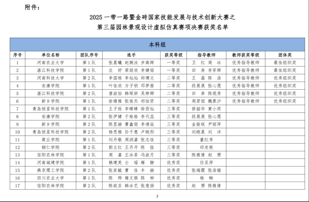 2025年12月20日,一带一路暨金砖国家技能发展与技术创新大赛第三届园林景观设计虚拟仿真赛项决赛在线上圆满落幕。beat365中文官网风景园林专业员工表现优异,共荣获国家级二等奖、三等奖各一项,同时获评“团体优秀组织奖”。