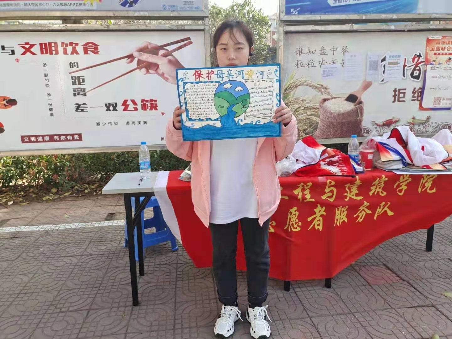 黄河是我们的母亲河,她哺育了一代代的中华儿女,她是中华民族的血液,永远奔腾不息。但是随着社会的进步工业得到突飞猛进的发展,生活垃圾、工业废料等已经对我们的母亲河产生了很大污染。为了我们的母亲河,土建服务队自愿组织通过绘画,手抄报的活动提醒人们保护身边的环境需要我们一起共同努力。活动进行时参赛人员蜂拥而至,在工作人员的指挥下,参赛人员有序排队递交自己的参赛作品。在活动中,工作人员收集参赛人员的作品,并对作品进行评选,通过采访问答形式,检测参赛人员对保护环境,保护黄河的意识。互动中工作人员更近距离传播爱护环境,保护水资源的积极观念。活动结束后,由工作人员指挥参赛人员有序离场,并清扫活动场地。