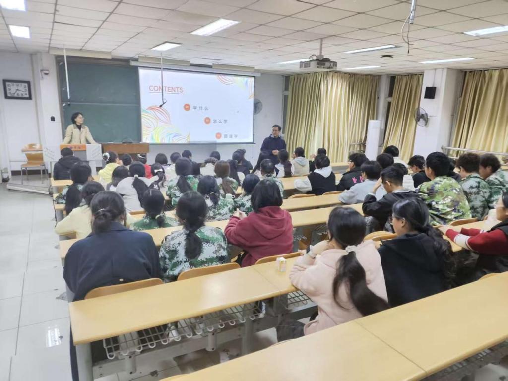 最后,2023级风景园林专业的陈煜赫学长走上讲台,从同龄人的视角分享了他在校的学习生活与思考。他结合自身经历,生动讲述了如何高效规划时间、积累学分,并分享了在专业学习与实践中的心得体会与宝贵经验。他真诚而风趣的讲述,引发了在场新生的强烈共鸣,现场气氛活跃,掌声与笑声不断。