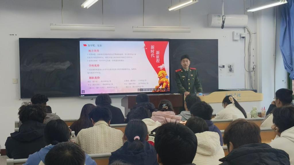 闫云威则聚焦“军旅收获与征兵政策”展开分享,他结合亲身经历,对征兵政策中“学费补偿”“国家助学贷款代偿”“退役补助金”等优待政策进行细致解读,为有入伍意向的同学梳理政策要点、解答疑虑。同时,他谈到,军营生活教会自己的责任感与抗压能力,是受益终身的财富,无论是日常学习还是未来发展,这些品质都能帮助自己更好地应对挑战、突破自我。
